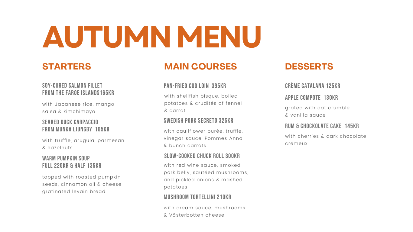 Vi erbjuder en a la carte meny i restaurangen som varierar från säsong till säsong.