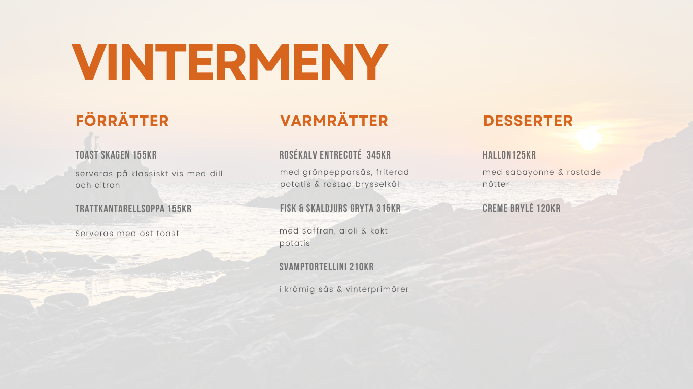 Under lågsäsongen (november – mars) kan restaurangen hålla stängt om vi inte har några gäster med middagspaket eller konferensgäster. Ring gärna för att kontrollera öppettider.